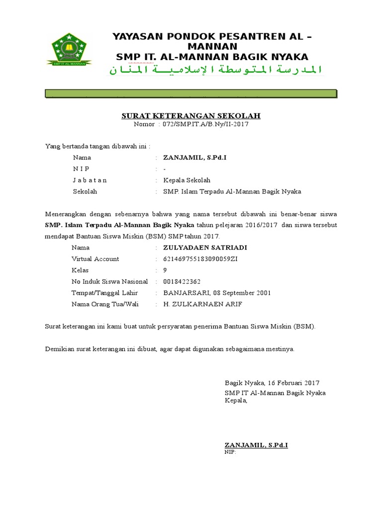 | Lihat Contoh Surat Keterangan Siswa Aktif Untuk Pencairan Bsm Pip Dibuat Kepala Sekolah Dadang Jsn |